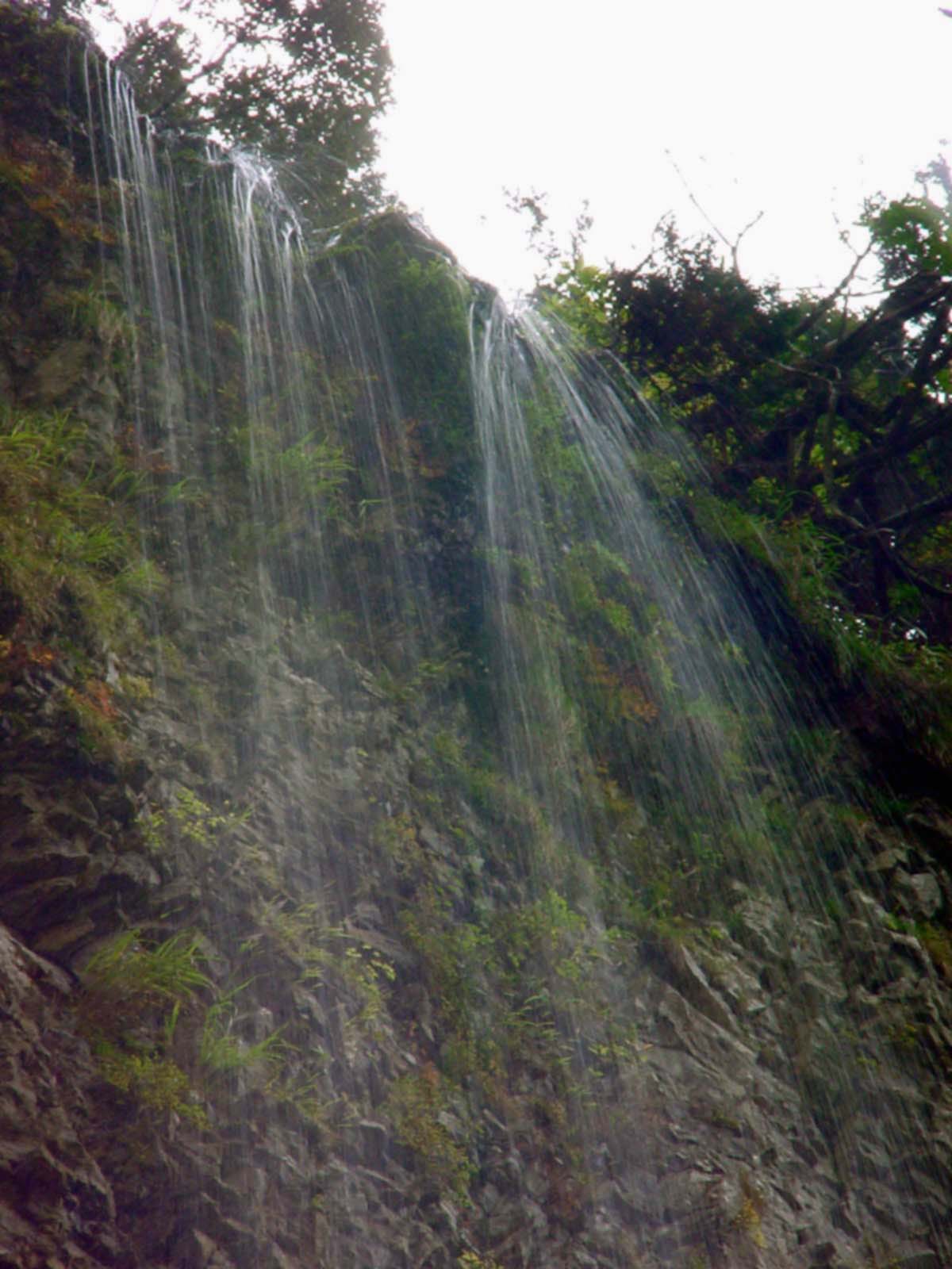 壇鏡の滝 (だんぎょのたき)2006/10/29 島根県隠岐郡隠岐の島町都万(つまん)那久(なぐ) 落差:約45m(雄滝) 滝の向き=西 西郷港近くのジャパレン・隠岐マリーナから「壇鏡の滝」をセットして出発すると「目的地周辺です。お疲れ様でした」・・・と林道坂道の真中でナビゲーションを終わってしまった。 この地点が滝に最も近い道路ということだ。耳を澄ましても滝の音もしない。地図範囲を広げてみると林道坂道のずっと先にヘアピン形に折り返して現在地の左手下の林にくる道路があることがわかった。 ヘアピンを折り返して神社鳥居をくぐり駐車スペースに到着で隠岐マリーナから丁度30分だった。 老人二人がポリ缶を車に積みながら「どこからこられたね〜?」と訊く。 「京都です」 「は〜あの遠〜くの京都から・・わざわざそりゃ」 「そうで〜す昔、ここに京都から流されてきたお公家さんがいた、あの京都で〜す」 と冗談っぽく答えると 「あはははは〜うまいこと言いんさる。よっぽど京都とは縁があるんかねえここは〜〜滝見?水が少ないですけんねえ〜〜」といいつつ帰っていった。 出発前に案じていたことが当たってしまった。 5分ほど歩くと壇鏡神社社殿に着く。 滝水がしょぼしょぼと風になびいて飛んでくる。 カメラ液晶で覗いたら確認できないほどの水量だ。 |