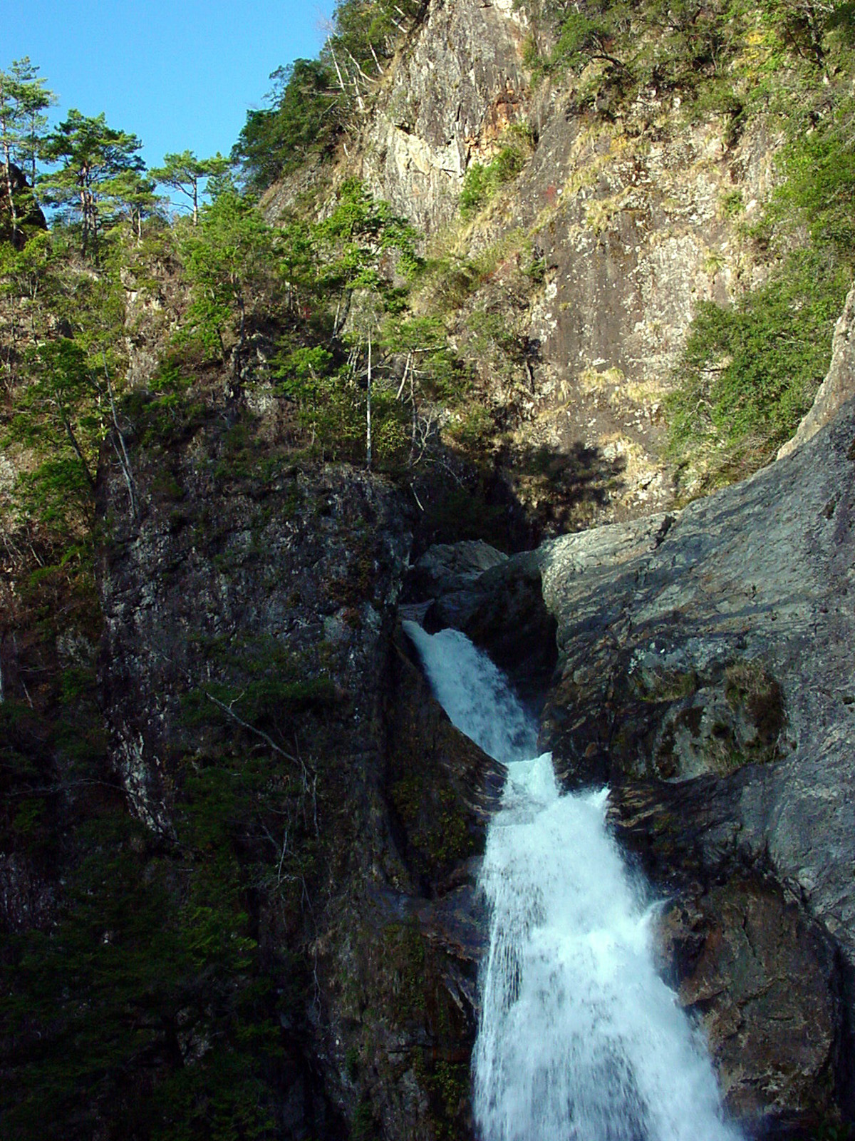 小さな一段目の滝身に青空が写ってきれいだ。