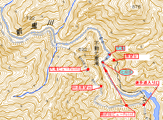 この時点で六段目と言われる林道展望台から流れ口が見えるのは七段目だと確定できた。 この確認は林道展望台からのこの写真と照合することで最終確認できる。 |