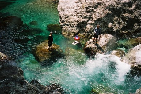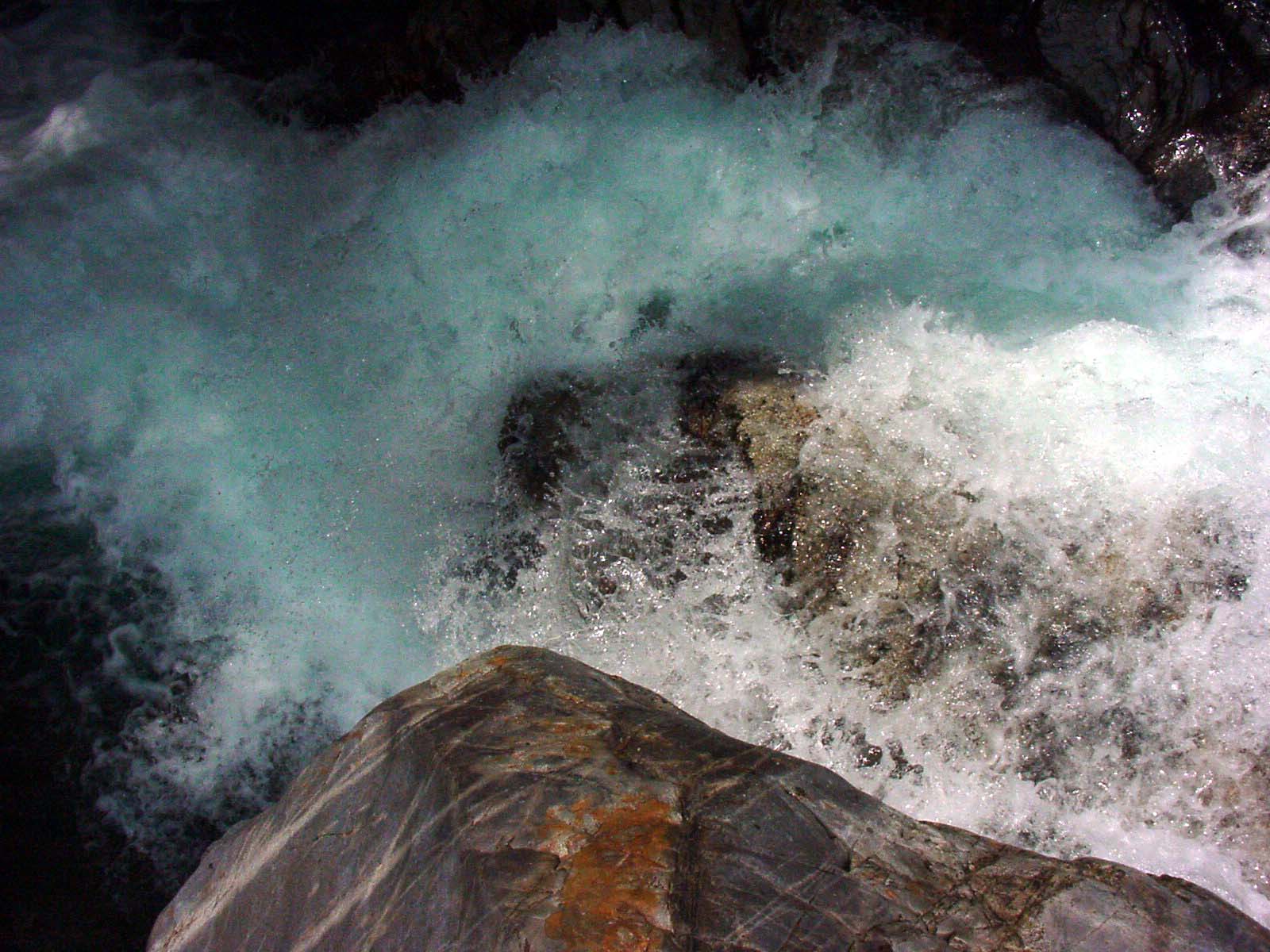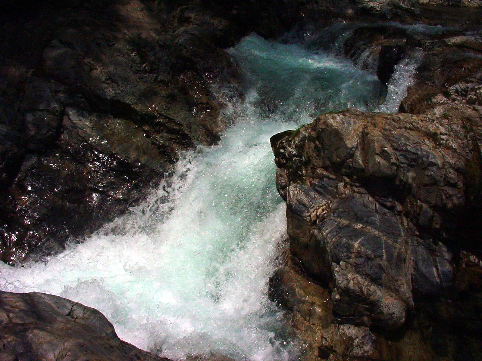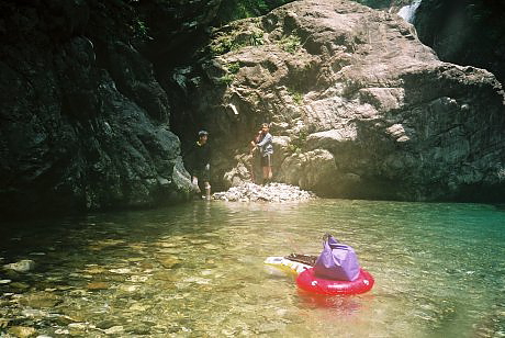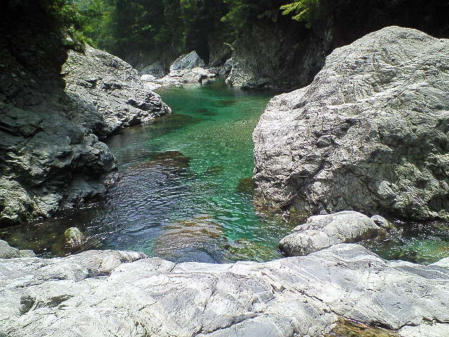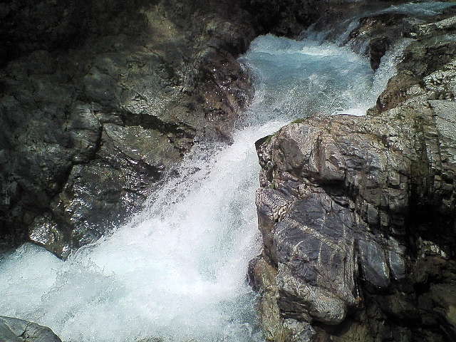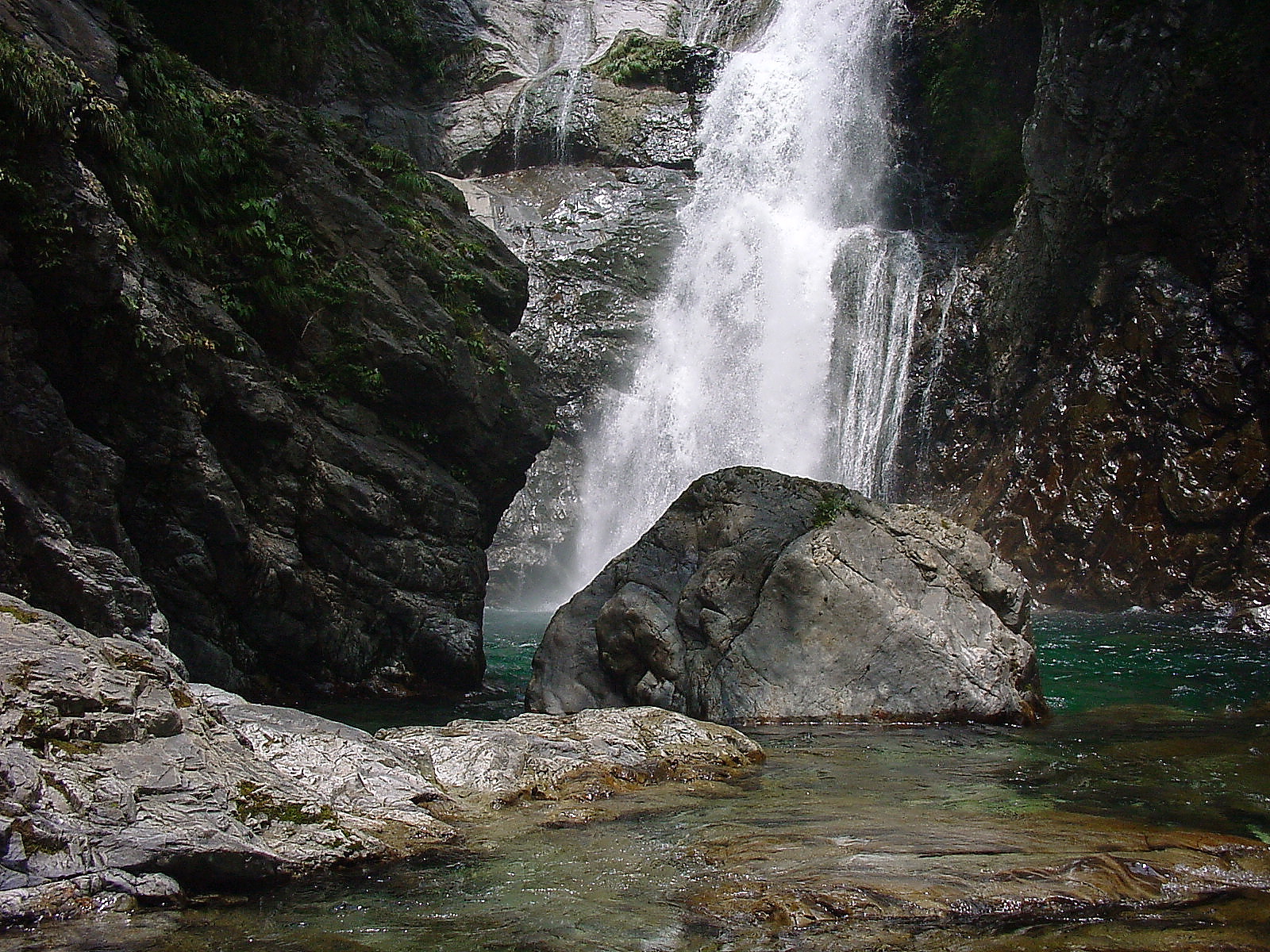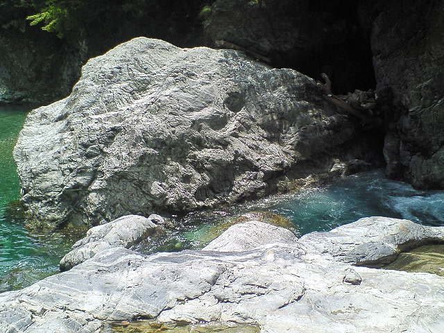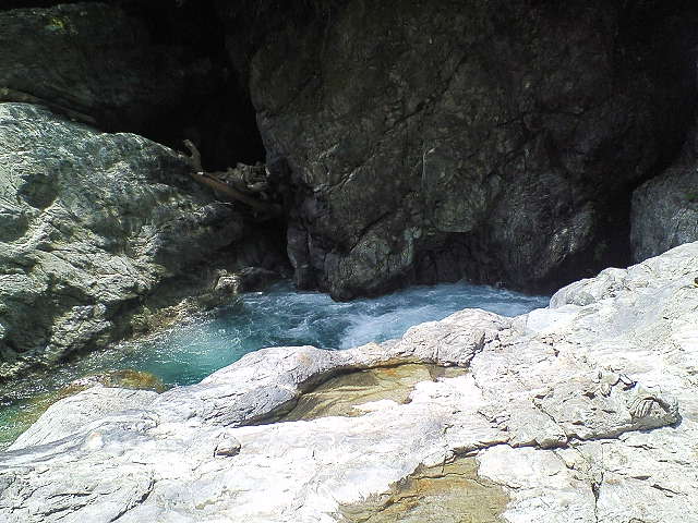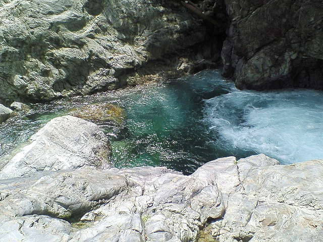 大滝展望台での目的を果たし川原に引き返し更に100m程上流の最下段前の沢を目指す。 七段目滝の下の中央の岩が「岸壁」で大釜がこの上に載っている。 この岸壁を登ると大釜の前に出られるはずだ。 |