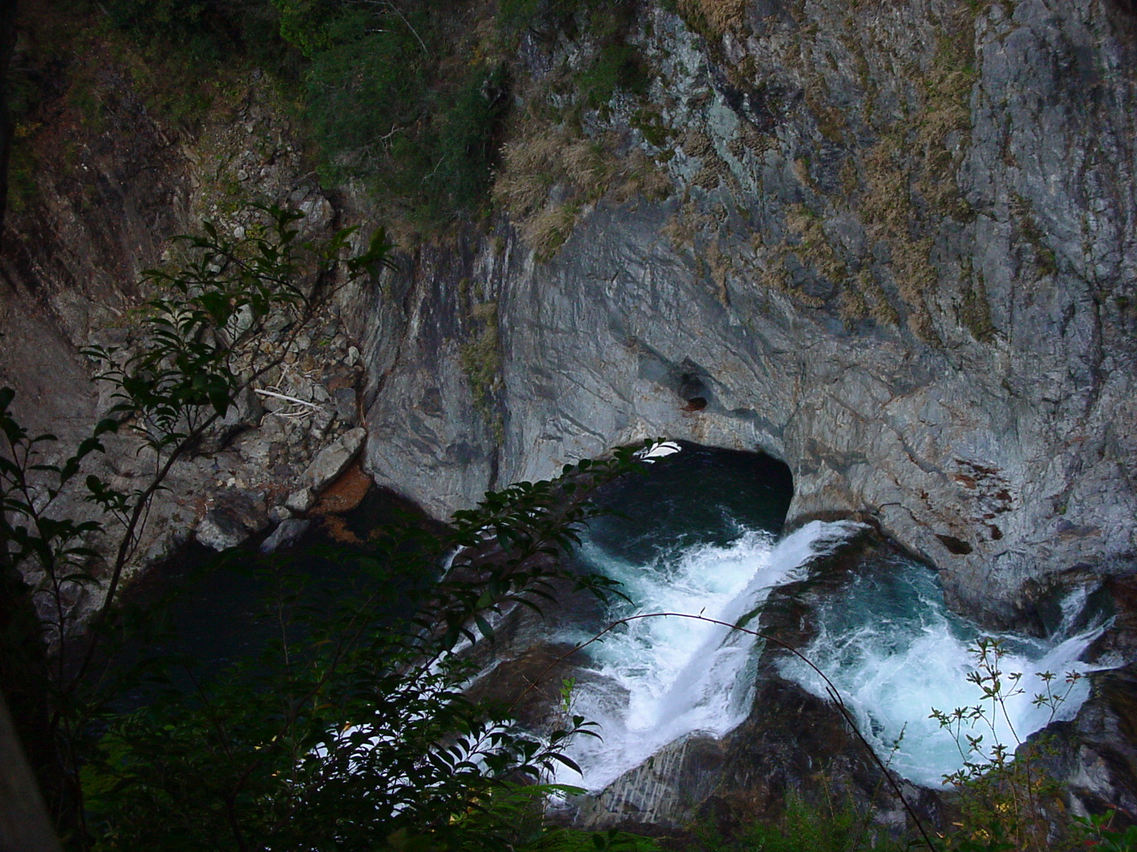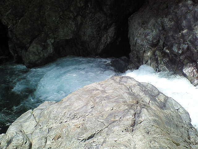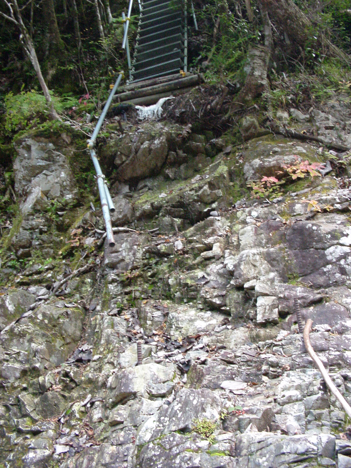 階段登り口 2004年台風でごらんのような状態 ここでカメラ、三脚、水以外は川原岩場に残し階段登り開始15分位で展望台。 先客を含め10名くらいがそれぞれ撮影、談話、休息。 |