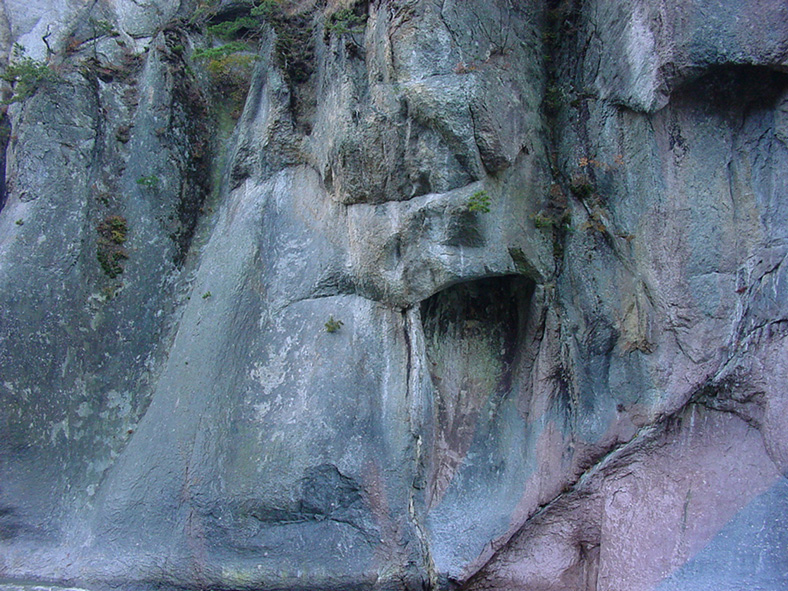 吹割の滝は高さ:7m、巾:30m余。 駐車場から階段をおり神秘的な般若岩の遊歩道を5分くらい歩くと滝の傍にでる。