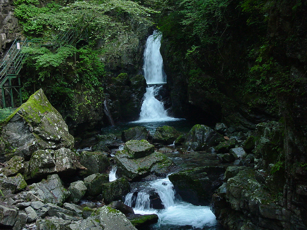 延長600mの渓谷沿いの整備された遊歩道を行くと鉄階段に沿って現れる。