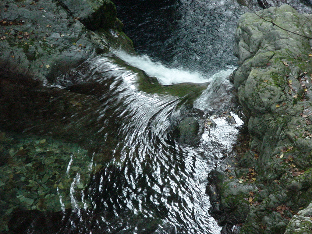 付知峡(つけちきょう) 2005/09/24 岐阜県恵那郡付知町付知峡 根尾の滝から降り「ひめしゃがの湯」で汗を流し慌ただしく次の目的地の付知峡を目指した。 下呂温泉を過ぎR257を左折し舞台峠からR256に入って間もなく付知峡の道標を左折3Kmほどで到着。 実は前夜宿のおかみの勧めはこの上流5Kmの「高樽の滝」(落差40m)だったのだが道路が閉鎖されていたため急遽、付知峡を観た。 「田立の滝」は、南東15〜20Km、御嶽山頂は北北東20Kmの位置だ。 裏木曽県立自然公園の一部で、付知川の上流に位置する緑深い峡谷が「付知峡」だ。 「森林浴の森日本100選」に選ばれその自然景観は美しい。 観音滝、不動滝、仙樽の滝が一円に落ちる。 |