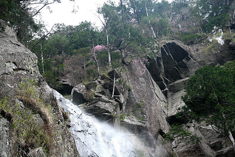 御来光の滝 2008/05/01 愛媛県上浮穴郡久万高原町若山 落差:102m 滝の向き=南 早速撮影はじめるがどうも気分が乗らない。 曇天のせいだ。 一しきり撮っておいわさんに「光が欲しいですね〜」と話しかけると「そう光が欲しいですね〜」と思いは同じだ。 ひろっさんはカメラ故障で手持ち無沙汰だ。 とりあえずコンビニ弁当を食べ滝の上の大岩を眺めながら「あの岩が落ちてきたらたまらんね〜」などとブルーな話になる。 そういえば毎度「おいわポイント」を目指すおいわさんは今日はその素振りもない。 コンデジ水浸のショックだけではない。やはり曇天のせいだな。 少し寒くなってきて誰からともなく「帰ろか?」となった。 11:15帰路につく。 |