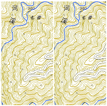 二つの地形図を左は左眼、右は右眼で平行にじ〜っとみていると左右図の中間に立体図が浮かんできます。 簡単にいうとヒンガラ目でみる。 傾斜を計算してみたら37°もある。 そんなところは日常の生活空間にはない。 |