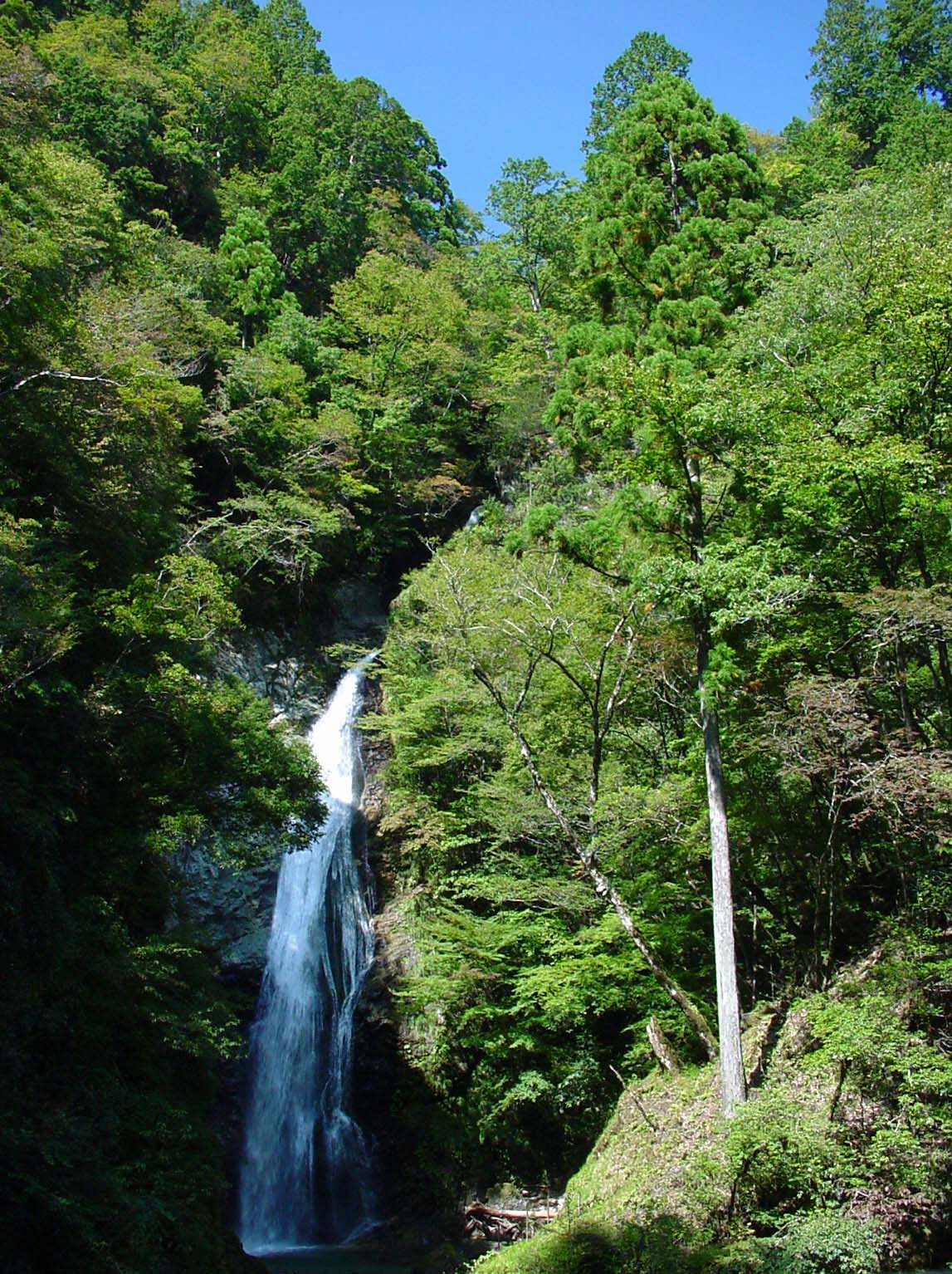 滝見橋(奥カエデ橋)からの眺めは、橋の補強ワイヤーが下段の夫婦滝を遮っていて不満が残る。
