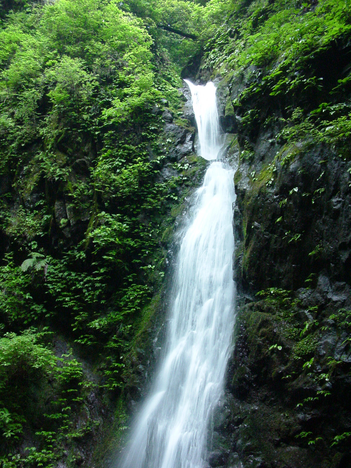 塩川滝 2007/06/02 神奈川県愛川町半原付近 落差:30m程度 八菅山修験の第五番の行所で熊野修験の系列に属していたとあった。 滝壷は無く岩の上に落ちる。 滝上流が江ノ島の洞窟とつながっていて、海水を落としているという言い伝えが滝名の由来とか。 厚木方面より国道412号線を進み、平山坂下交差点から約1km先の巻き道へ右折、その後200m先左折・直進。 小川の橋を渡ると未舗装路となり、少し進むと駐車場がある(無料)。 駐車場からは歩道が整備されていて、1分程で滝に着く。 当日、Am5:00本厚木駅前で”滝の引力”のイチローさんと合流、御来光の滝で知り合った東西の滝仲間同志の「一期一会滝徘徊」がはじまったのだ。 手始めは本日メインの「早戸大滝」訪瀑に先立つam5:40塩川滝を訪ねた。 「早戸大滝」ヒル対策の塩にちなんだ選滝と解釈。 変な滝だ。 滝が変なのでなく滝前の観瀑台が変なのだ。 滝ファンに訊くと、観瀑台の下に潜入するのが正しい鑑賞の方法なのだという。 私は、滑って怪我をしたくないので、観瀑台の上で撮ったが、どう見ても不自然な絵だ。 関係者は、観瀑台を作る前に滝ファンに訊いてほしい。 おなじく御来光の滝で知り合った"カリスマ研究所"のあじゅさんの家が近いようだ。 |