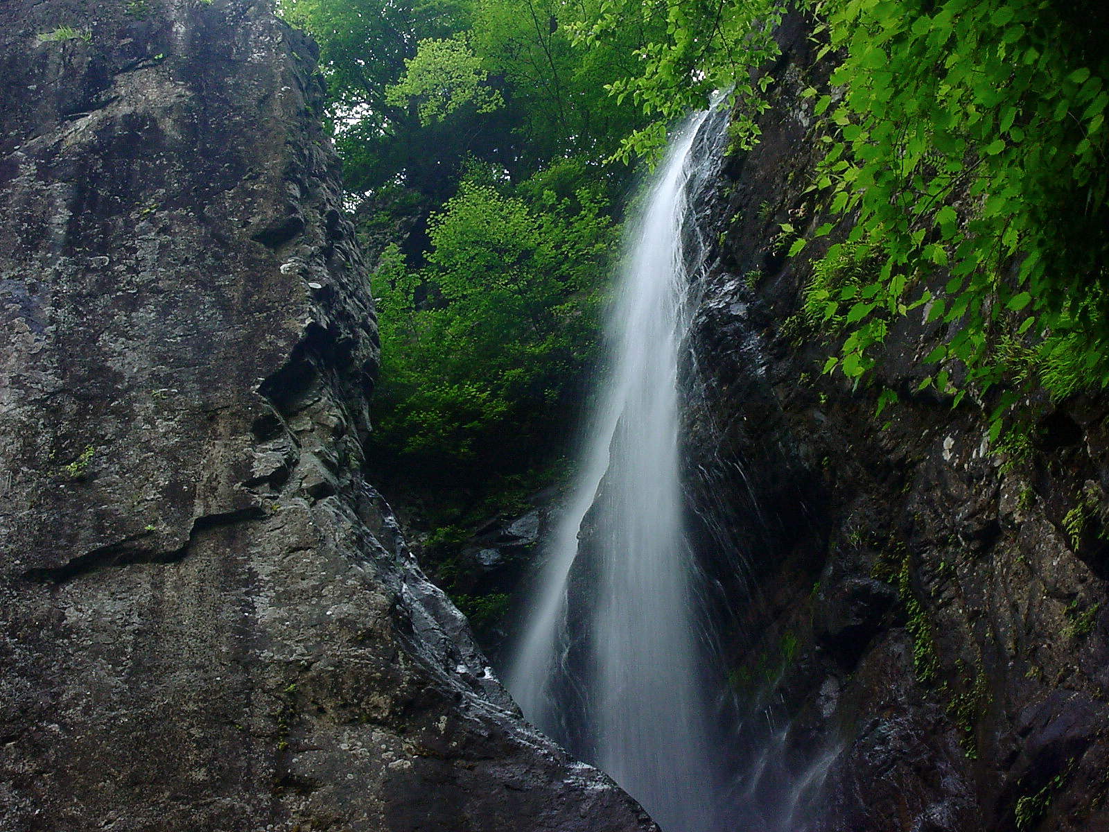 斜面で三脚を二脚に組んで見上げると大岩に隠された石室内に高圧シャワーのようにぶちまけられた水流がみえた。
