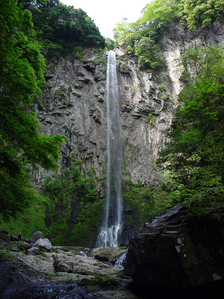 東椎屋(ひがししいや)の滝 2004/04/30 大分県宇佐市安心院町(あじむまち)東椎屋 落差85m、幅3.3m 別名“九州華厳”と言われるだけあって典型的直漠で美しい。 湯布院温泉の北10km、別府温泉の北西15km。 下流に甌穴らしいものがみられるが顕著なものでない。 西椎屋の滝、福貴野の滝とともに「宇佐の三滝」と言われる。 U字カーブ路の松茸茶をふるまってくれる土産店の横の滝入り口から約10分川傍の道を歩く。 当日、水量は少なく滝つぼに散らすように降りていた。 水量の多い時は幅が三倍くらいになるようだ。 |
