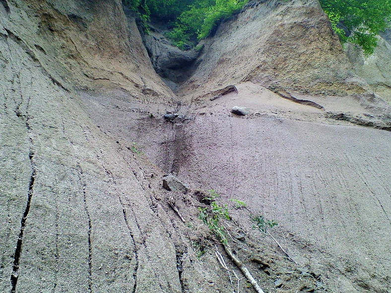 「インクラの滝」展望台到着で川沿いを歩き出し20分程でこんな土砂くずれの壁。