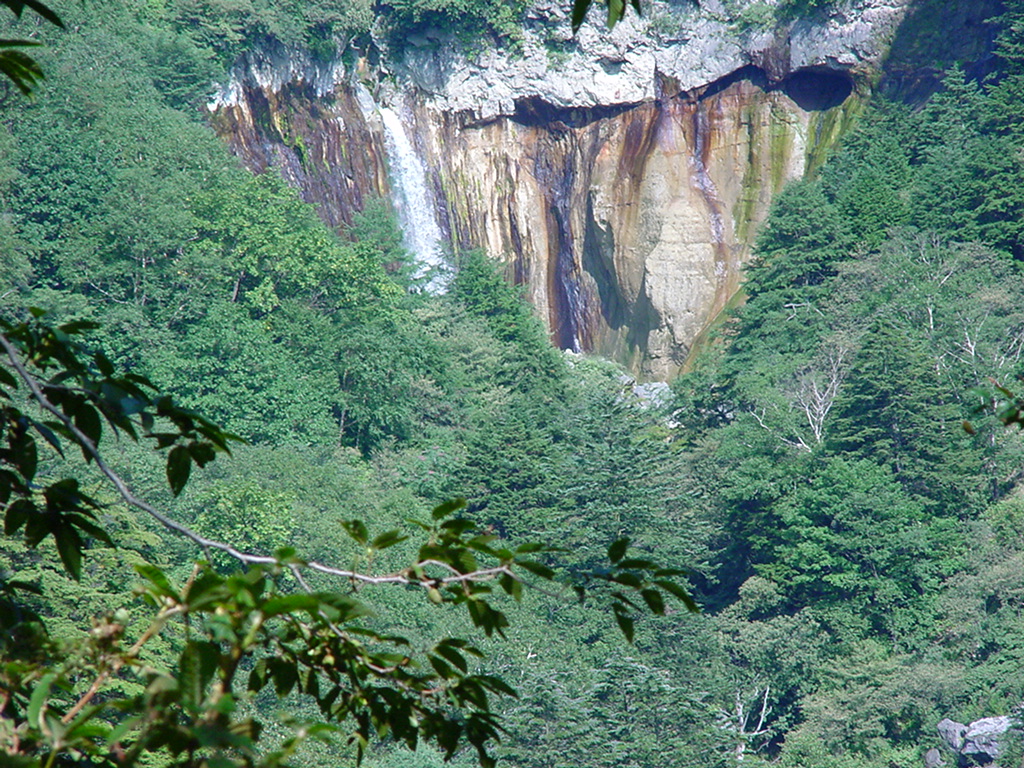 活火山万座・白根山の東南に落ちている滝だけに地球の膿のような成分が岩肌に滲み出ている。 有名な「湯釜」(PH1前後と世界で最も酸性度の高い湖)はこの上流になる。 数年前までは難攻不落で超マニア向の滝だったようだ。 2Kmほど離れた遠望滝見台から見ると「さあ!かかってこい!」と言わんばかりに異様な岩肌を見せて堂々と構えている。