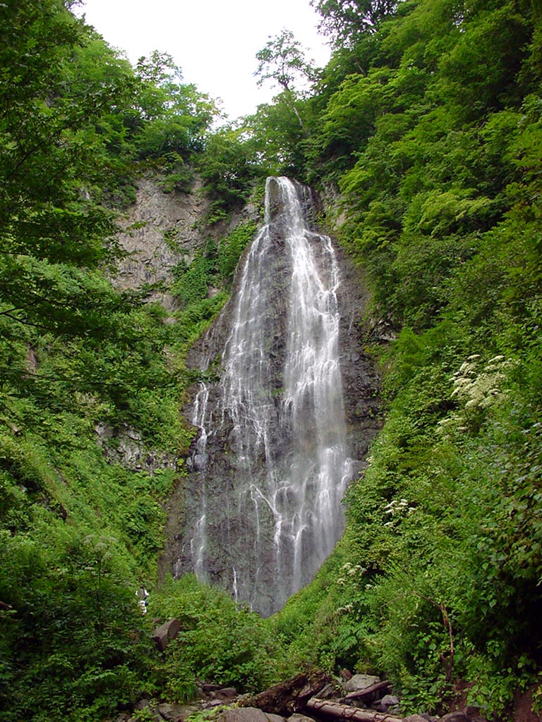 くろくまの滝 2004/08/15 青森県西津軽郡鯵ヶ沢(あじがさわ)町大字一ツ森町 落差:85m、幅:15m 津軽半島の根元の世界自然遺産・白神山地(1000〜1200m級)から流れ出る水は宿の水割りを格別な味に変えた。 旅館 熊の湯温泉(一ツ森町湯湧淵31 TEL:0173-79-2518)から駐車場まで車約20分、さらに歩15分程で滝に着く。 この日、陽光が滝にスポットライトのように照ったり陰ったりを繰り返し、雲の流れが怪しい雰囲気を醸した。滝の壁に無数の菩薩を見る人もいるというが私には滝全体が巨大なビン・ラディンに見えた。 鰺ヶ沢の海は、今や昔年の交易港としての役目は終わりを告げたものの江戸時代から漁業が盛んで、大漁や城の行事の際には魚を献上する習わし(肴飛脚)があったそうだ。 |