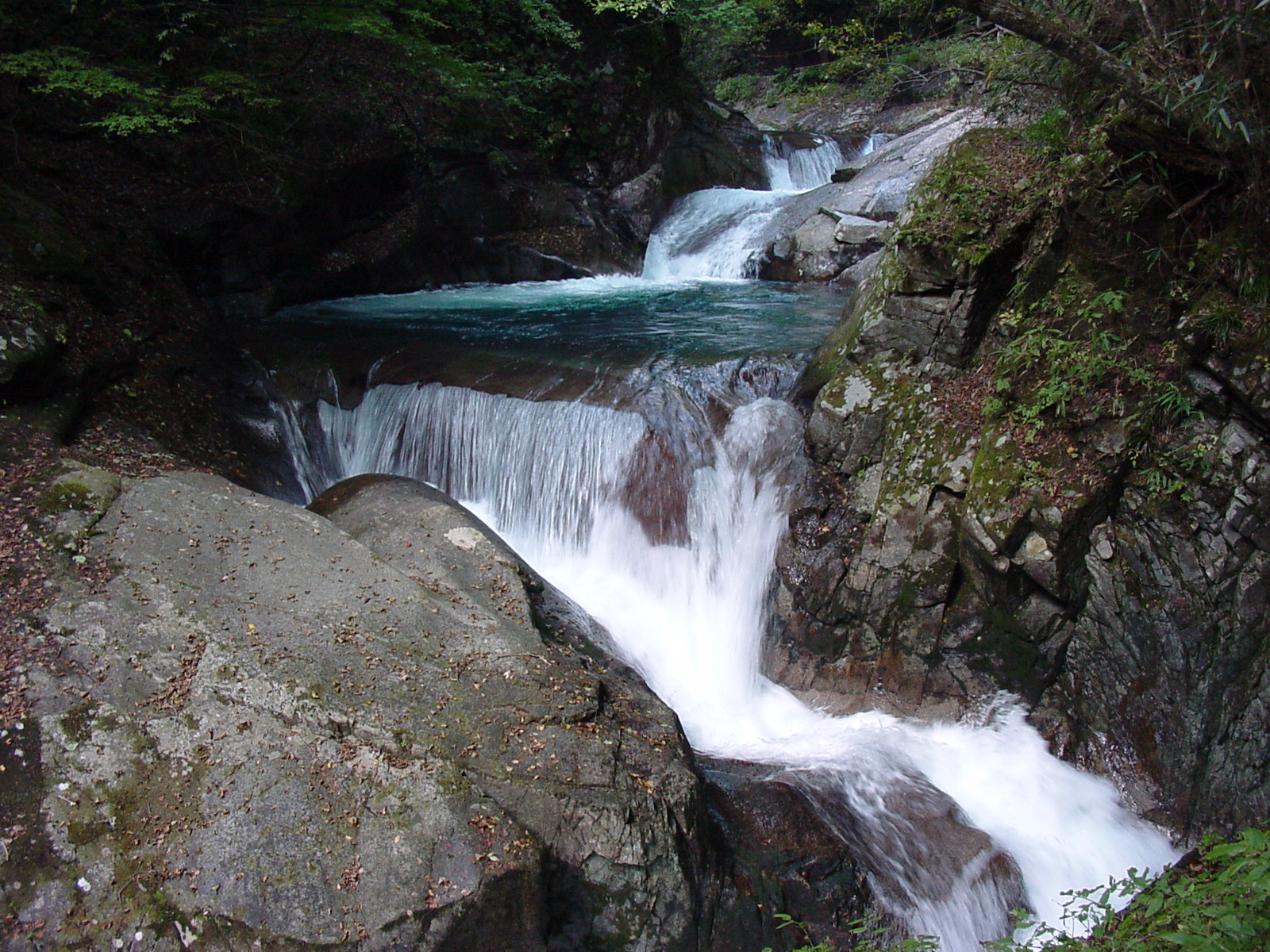 「大久保の滝」から10分くらいで「三重の滝」(駐車場から50分前後)だ。 コースからかぎ型に谷に降りる分伎した滝見台からみる。最下段は谷の幅方向に横切るように曲がって岩の樋となって落ちていく造形美は多くの写真家の題材にもなっている。
