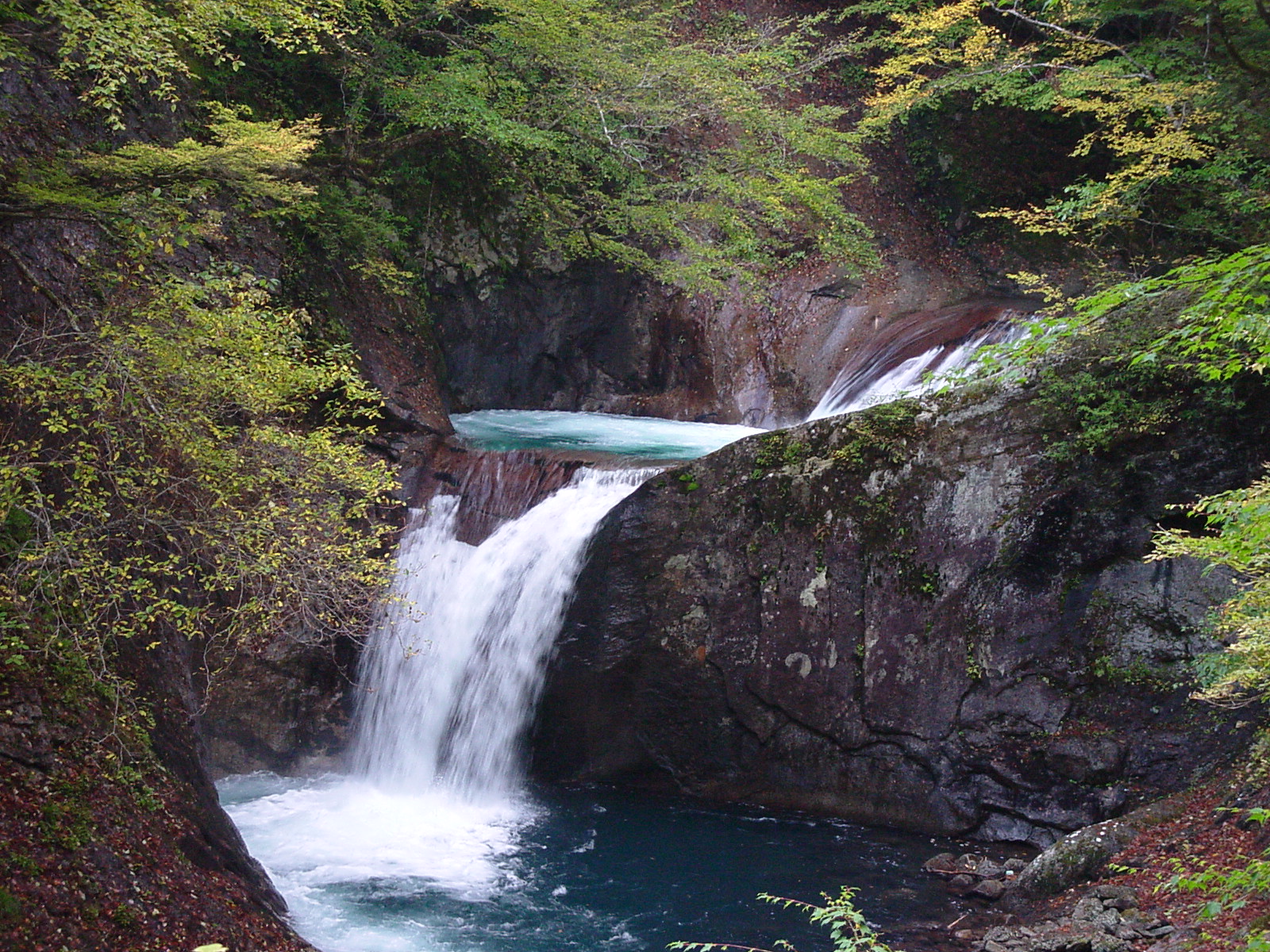 中段にエメラルドグリーンの釜をかかえるバランスのとれた毅然とした滝。
