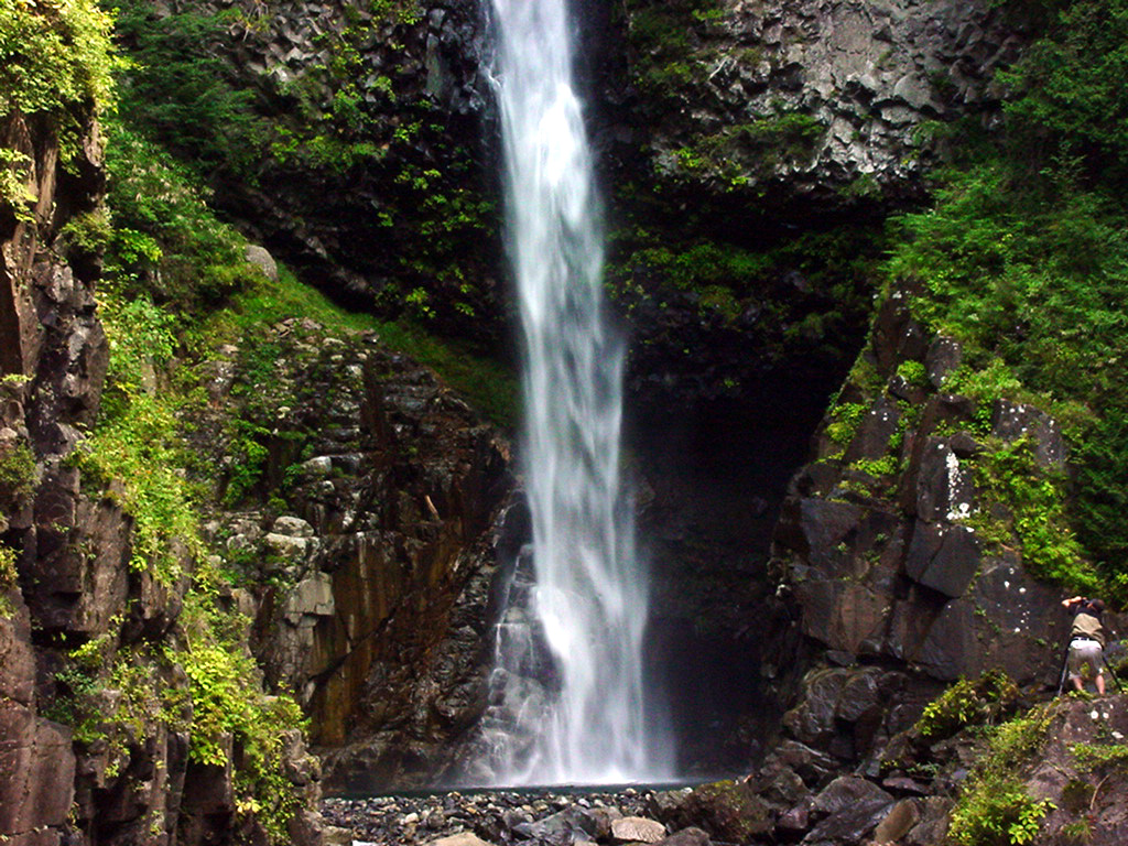 根尾の滝 2005/09/24 岐阜県下呂市小坂町落合 落差:63m 根尾の滝駐車場を9時半出発。 1時間コースとの情報だが、滝到着11時から逆算すると1時間半弱の行程だった。 もっとも、中間地点(残1.2km)のあまどり岩というイワツバメが営巣する岩の前で長話の休憩を含むので70分程度か?? 単純な景色の山路で唯一の楽しみが【あとxxM】の標示。最後の急坂で沢に出ると荒れた砂地の川原の奥に滝がりりしい姿をあらわす。 復路はほとんど下り坂で楽なコースだ。最大の難所は、橋から駐車場までの最後の登り坂だ。 地図の等高線が密集して直線では僅かの蛇行急坂は、日頃の運動不足を思い知らされる。 |