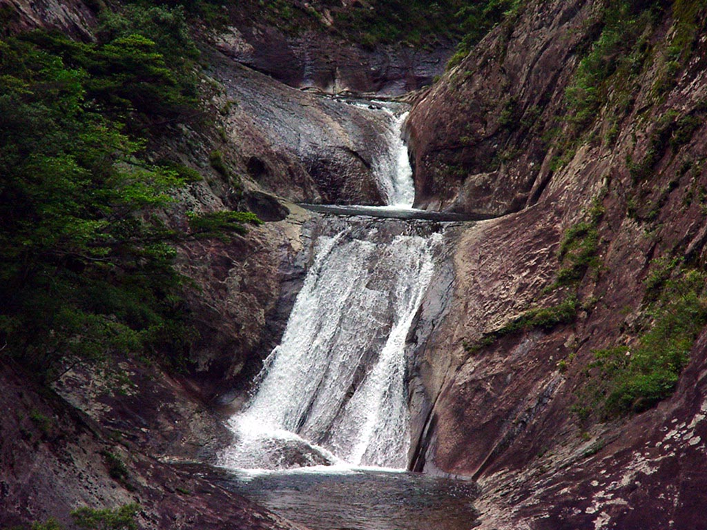 布引の滝 2006/05/29 三重県南牟婁郡紀和町小栗須 落差:53m 4段からなり、1段目から12m、3.5m、7.7m、29.1mの落差。 1段目の滝は展望台から見えない。 林道の細道は軽自動車がいいつもりで予約。 ところがレンタカーの配車は軽ダイハツ・コペンFF/0.66リッター直4DOHC16バルブターボ64ps/6000rpmとスポーツカーが配車されてきた。それも真っ赤な2シータ。面映い思いと多少なめたおもいでアクセルを吹かすと小気味よく不安を感じさせないスタビリティは、なかなか見事。小カーブの続く山間では、FFの喰いつきはかえって安心感さえわく。 |
