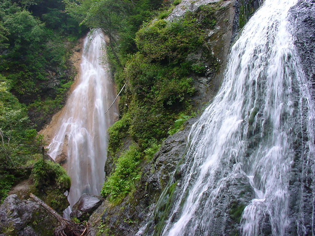 黒い沢の滝(右)と、小大野川の滝(中央)。