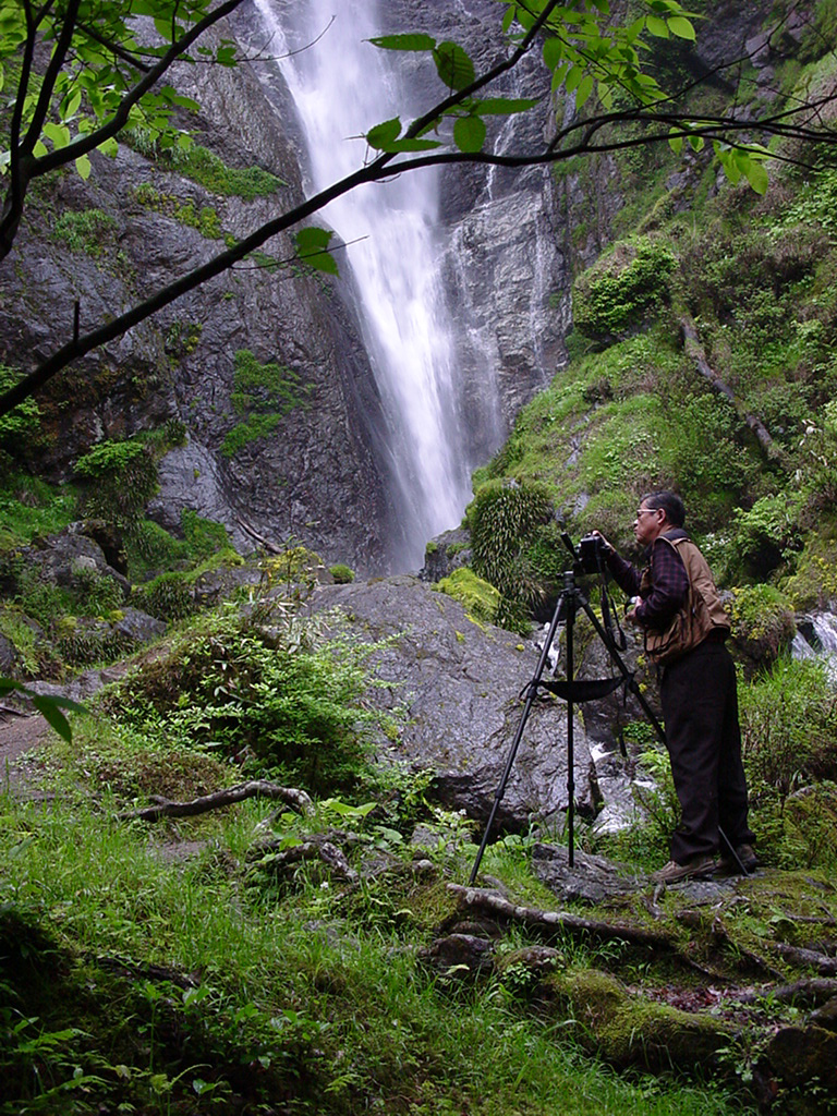 鋭意撮影に熱中の佐々木氏と「栴壇轟の滝」。 。