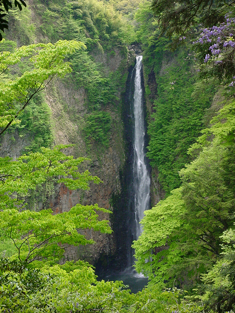 震動の滝 2004/04/30 大分県玖珠郡九重町田野 落差:83m 滝壷1600平方メ−トルの男滝(震動の滝)と落差98mを滑るように落ちる滝壷のない女滝や子滝、孫滝など、四条の滝があるという。 水量の多い時は周囲を震動させるほどの勢いがあることからこの名前が付けられたとか。 近くには川端康成が小説 ”波千鳥”の構想を練るために投宿した筌の口(うけのくち)温泉 がある。 当日、観漠橋の工事中?で立ち入り禁止。 密かに滝対岸の観瀑ポイント(急な崖で転落の危険あり)に潜入してシャッターをきった。 女滝は全貌をみられないばかりか子滝、孫滝も確認できなかった。 |