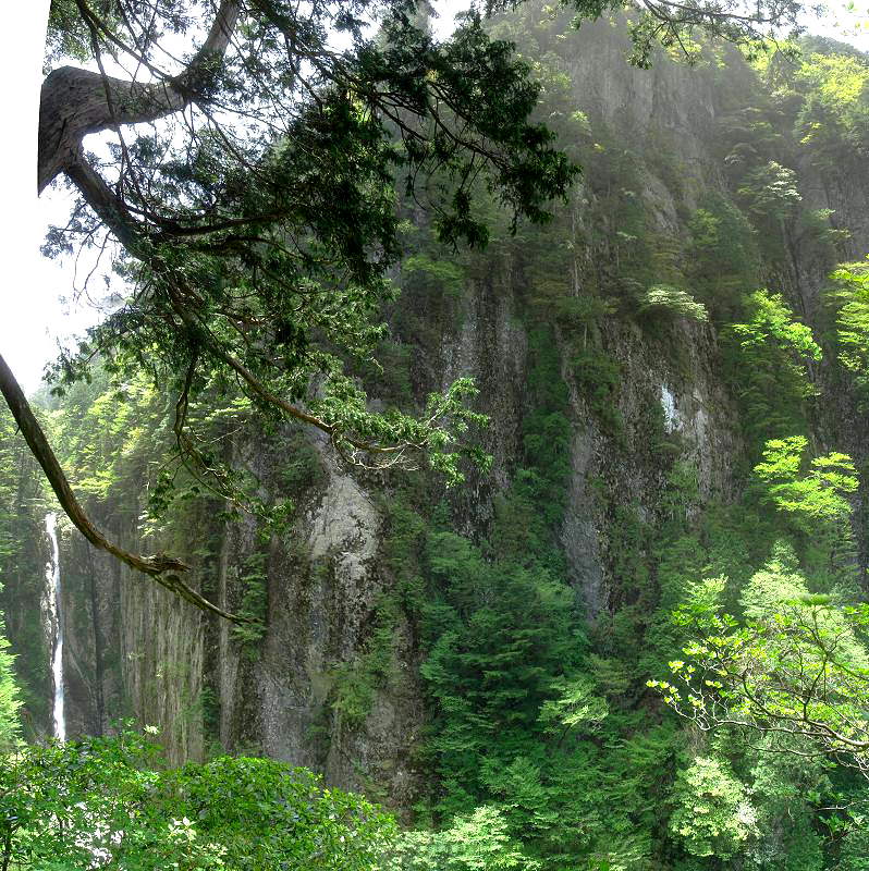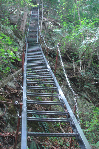・10:02 天空の鎖場登り眼下に歩いて来た谷がはるか下に見える。ここが堪らなく爽快な場所だった。 グライダーでスーっと飛べたら最高だ。 「おしっこー」って聞こえたけど誰? :・・・(5時間02分経過) この後・登り梯子はNo28で終了。 ・大きな岩の傍の鎖を伝って蟹歩きの回り込み路 ・そして4つの下り梯子で滝前テラスだ。+600m |