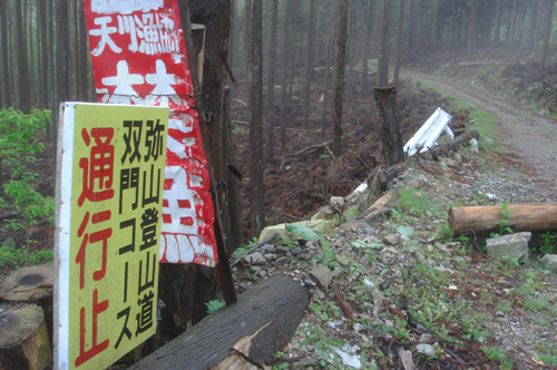 ・5:33 白川八丁:水のない川原への降り口。 双門コース通行止めの標示 ここまで乗用車でも乗り入れ可能な平坦な土道だが歩くと一汗かく登りだ。+100m :・・・(33分経過) |