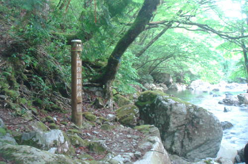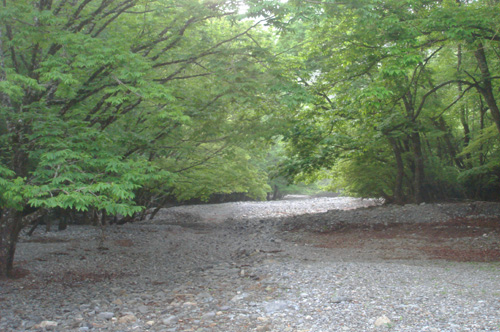 ・5:35 弥山川・白川八丁の水の無い川原に到着。この地下を伏流水が流れていて2〜300m下流で姿を現すのだ :・・・ 小休止。(35分経過) |