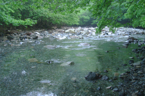・5:52 白川八丁:水が伏流しはじめる川原に到着。通常なら更に上流のはずだ。 :・・・(52分経過) |