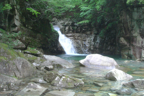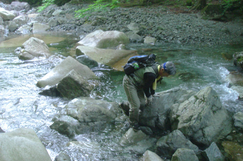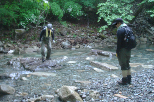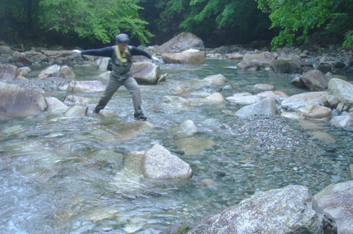 ・白川八丁:何度も何度も左岸、右岸の渡渉繰り返し。右のたけちゃんは、キャッチャーをやっていたので足腰が通常人の数倍強い。とても初心者とは思えない。 |