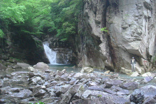 ・6:38 ガマ滝は見えるが近づけない。 途方にくれる男 この後、男はジャブジャブしましたとさ!言わんコッチャない。 :・・・(1時間38分経過) |