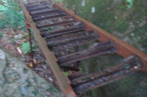 ・6:59 弥山川右岸の川沿いに架かる大半の鉄の橋は朽ちたり崩落したりしていて登山道とは言えない荒れた状態だ。最初の朽ちた橋通過 :・・・(1時間59分経過) |