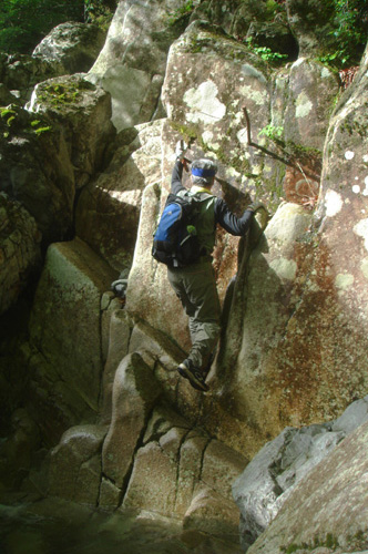 ・8:00〜8:30 左岸大岩群の大岩を、四つんばい、抱きつき、潜り、直角曲がり、鉄棒ぶら下がり、岩登り、最後は古びたロープで橋下駄に無茶苦茶よじのぼり :・・・・(3時間〜3時間半経過) |