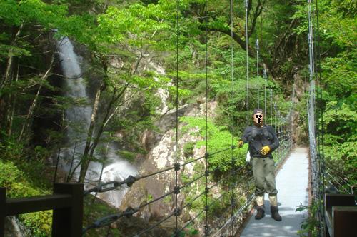 ・8:39 吊り橋を渡り、No1小梯子を下り虹の出た一の滝撮り。「俺撮って!」たけちゃんは写真には興味ないのだ。 :・・・(3時間39分経過) |