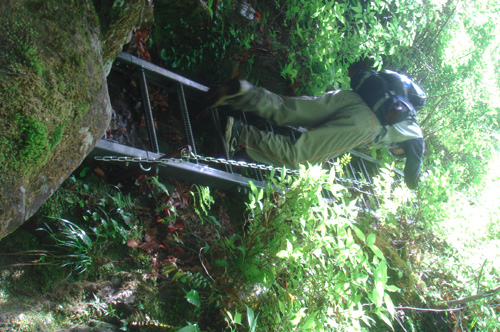 ・9:49 水平梯子。下は底無しの谷。 はじめさんいい靴はいてんな〜。 :・・・(4時間49分経過) |