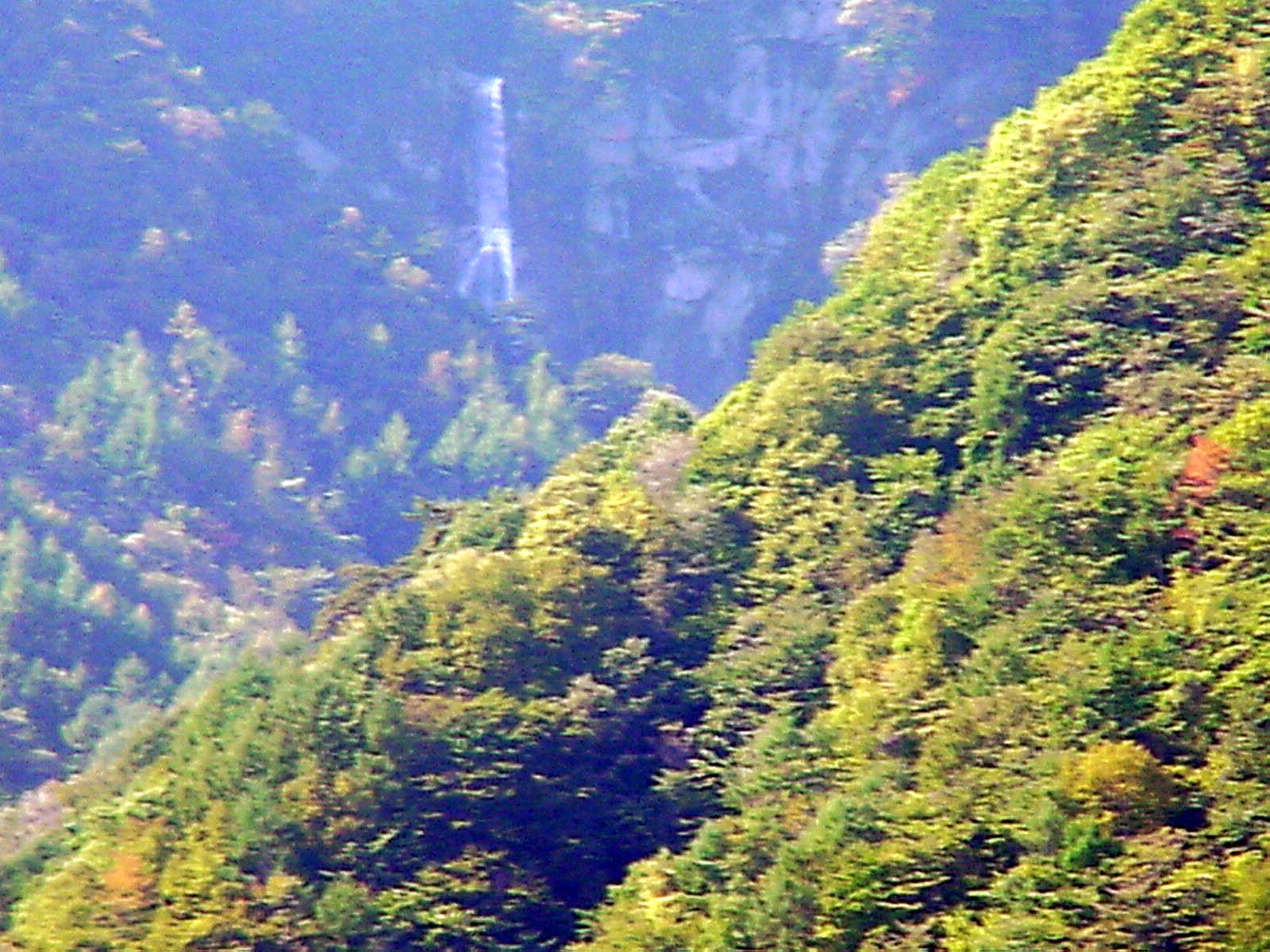駐車場に向かう林道の峠の途中に「展望台」標識があり、北精進ヶ滝を道端から遠望できる。