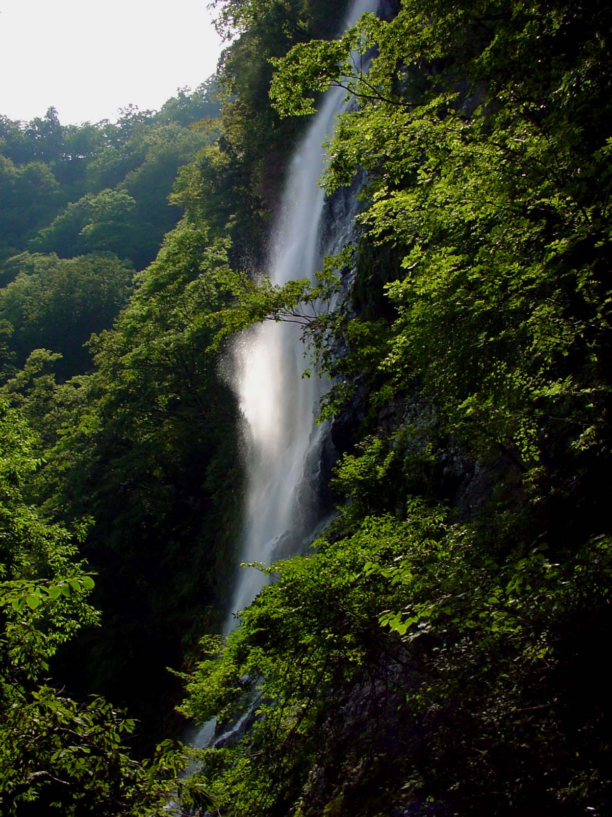 天滝 2006/09/21 兵庫県養父市大屋町筏(いかだ) 落差:98m 東南向き ビューアングルが多彩なこの滝は、滝が東南向きであることをまず念頭におく。 それぞれの滝には固有の地形上のビューアングル制限があるが、天滝はその制限が比較的少ない。 ただ、この滝に限らずビューアングルには適正時間帯がある。 出来るだけ天気の良い早朝(この季節で7時半ぐらい)に行くと滝にかかる虹が見られるようだ。 近在の宿にでも泊まって早朝アプローチが条件となる時間帯なので調べてみた。 【なかま温泉なかま荘】天滝公園に近い、公共の温泉宿泊施設で山里の民宿といった風情で、氷ノ山の登山客などによく利用され温泉らしい温泉とのことだ。(問合せ:大屋町中間399 TEL0796-69-1062 1泊2食付 9,000円〜) 川下の下滝見台、正面の上滝見台、上滝見台の奥、滝の中腹横の岩場、正面滝下などほとんど全方位といってもよいほどだ。 一時間くらいで早々に引き揚げてくるのでは惜しい。 紅葉シーズンは一般客で混みあうため、各ビューアングルの撮影時に不満がのこるかもしれないと感じたのもそういう理由からだ。 この日、停滞の影響のため午後2時ころ滝到着では、すでに逆光気味であった。 ビューアングルが多いと私のカメラのように旧型になるとバッテリーの持ち時間も頭が痛い・・・。のんびりPLフィルターを廻す時間も惜しいのだ。 |