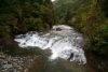 「四階滝」 大川目川本流 =五色湖を渡った三叉路から3.4km。道路脇に駐車スペースと「四階の滝展望所」案内板。