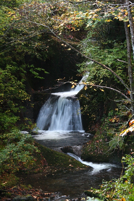 弥栄(いやさか)の滝 2010/10/11 秋田県北秋田市森吉 小又川支流 大印沢 落差:10m 滝の向き=北 道の駅「ふたつい」朝の天候は良好。 東北ツアーのメインイベント「桃洞滝」、「幸兵衛滝」を決行することになった。 5時50分道の駅をスタートしr197>R105>r309と辿りクマゲララインにハンドルを切る。 クマゲララインの坂道の途中に出てくるのが「弥栄(いやさか)の滝」だ。 全貌が見え難いが形のいい滝だ。 標柱の傍からあわただしく撮り更にクマゲララインを登って行く。 いよいよ「桃洞滝」に接近だ。 |