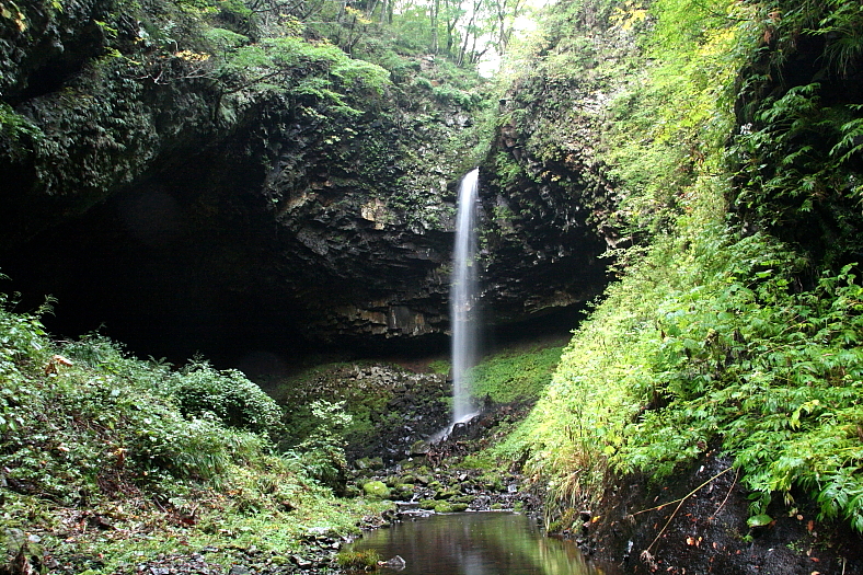 「大柄滝」の落ちる谷に急な階段で降りると柱状節理の岩の裏見滝は暗く陰気。