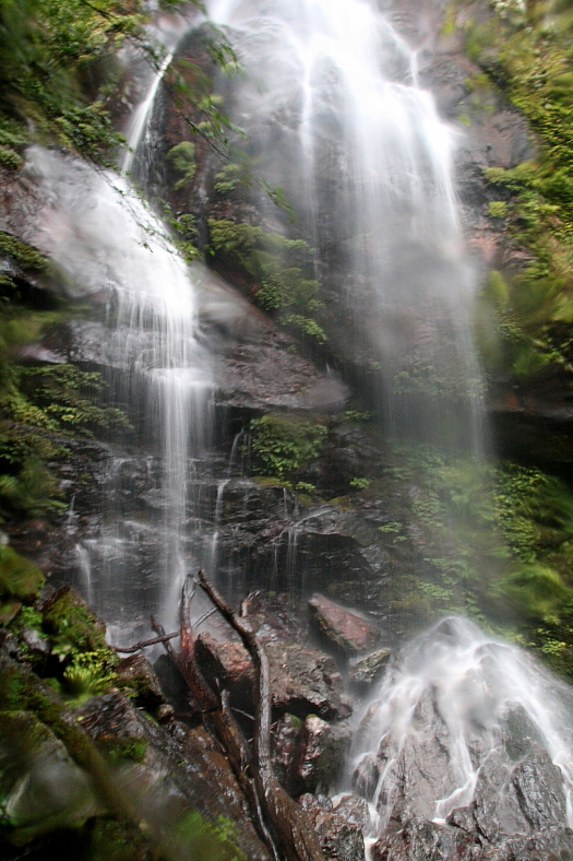 橋を渡り滝の下に急勾配を登って行くと凄い飛沫でまともに撮れない。