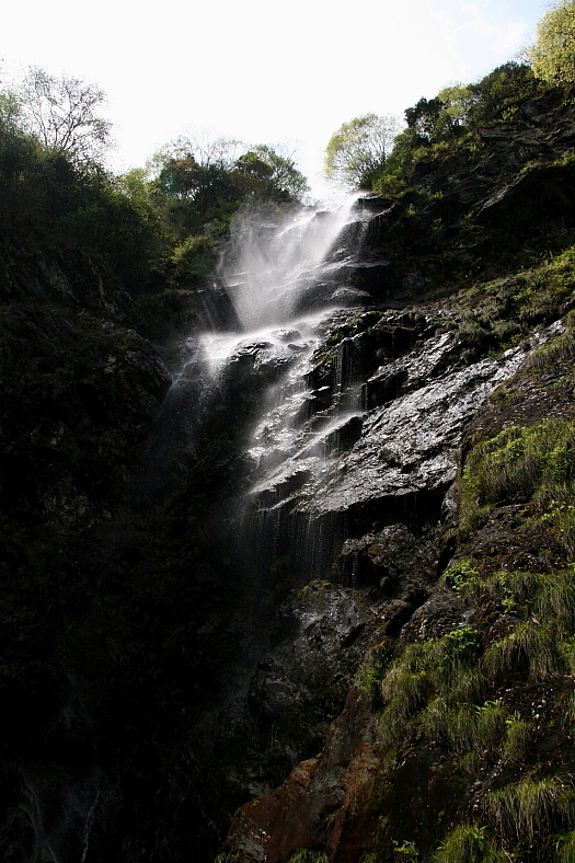 大樽の滝 2011/05/01 愛媛県西条市藤之石庚 加茂川支流 谷川支流 落差:70m 滝の向き=北東 時間的に早くしないと滝頭のコントラストがなくなる。 昨日の「御来光の滝」地獄の登り返しの筋肉痛が少し残っているが二人は滝までの短いきつい傾斜を急いで登る。 滝壺は最近人が入った形跡がない藪漕ぎ状態の中、強引に入り込むと滝壺の周りは岩床の比較的荒れてない移動が容易な状態だった。 やはり滝右岸の東側は太陽の影がかかっている。 しかし滝頭は陽光が降り注ぎ右岸の樹影と透過光の縞模様を投げかけている。 光環境は「高瀑」とほぼ同じだ。 |