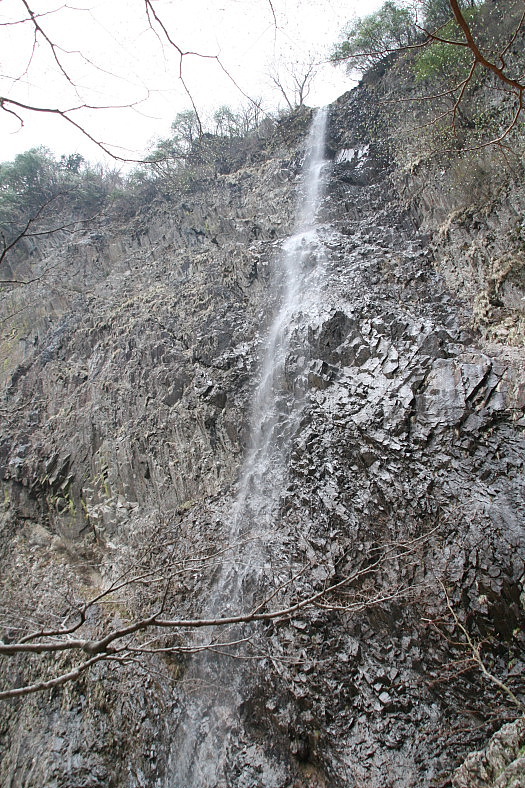 12:06 「天狗の子育て岩」前を颯爽と行くおいわさん。天狗は妻帯者なのか?? ・ ・ ・ 12:10 高瀑到着!!。眼の前の高さ132mの絶壁の広がりは有無を言わせないすばらしい眺めだ。 |