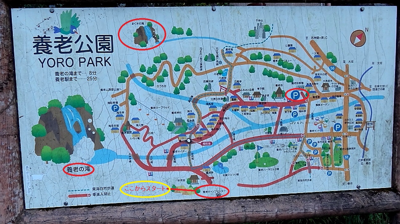 「養老の滝」下流の川を渡った道路を上流側に辿るとキャンプセンターの案内表示が出てきます。