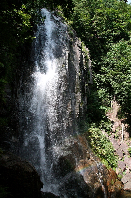 大倉滝 2010/07/24 岐阜県高山市清見町坂下 川上川支流 大倉谷 落差:30m 滝の向き=西 7月24日高山直行の高速バスに乗り込むと乗客は高山〜上高地観光目的の中高年のご婦人が大半。 登山靴、薄汚れたリュックに三脚という出で立ちの”おっさん”は場違いな雰囲気。 高山”ホテルアソシア高山リゾート”に降り立ちホテルのドア嬢の怪訝そうな表情は無視して待機の”写録の旅人さん”のBunksに乗りこみ目指したのが「大倉滝」。 渓谷はよく整備され7年程前に訪れた経緯のある”写録の旅人さん”は上の駐車場から「大倉滝」主瀑だけみて下の駐車場に待機していただく。 我輩のみ「百滝渓谷」を下って行くことにした。 多くの方は渓谷の下流から上流のレポとなっているが、上流からのコース取りが断然容易なはずだ。 滝名などの表示が下流から登る人向きに配置されているため見逃しやすいことが注意点だ。 |