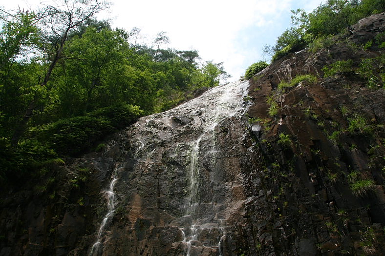 多羅多羅の滝 2008/07/13 広島県 広島市佐伯区湯来町大字和田 水内川左岸の支流 落差:上段:10m、中段:25m、下段:19m 南向きの滝だけに水量のあるときは豪快に落ち虹が綺麗だろうと想像できる。 撮り終えて下段の滝上から覗くと既に降りていた写録の旅人さんが滝下の岩に座って我輩の屁っ放り腰の鎖降り観察体勢でいる。 ありがたいことだ。 単独でこういう所に来ると万一の事故時には救援を呼ぶ方法がないのだから・・・。 ただ何となく好みで言うとこういうスリル感のある所が好きである。 登りに思った”大袈裟な鎖”は下りには心強く感じたのだから身勝手もいいところだが・・・。 |