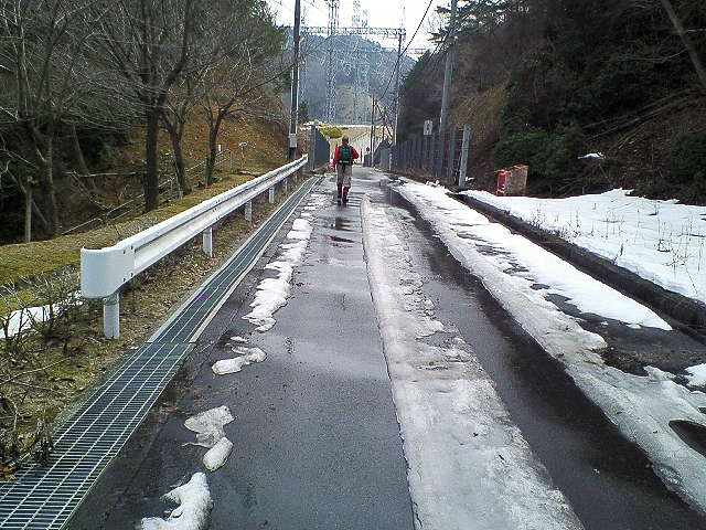 歩き始めると北面の雪道がしばらく続くが左折して谷の方向に向かう坂の舗装路からは雪は無い。