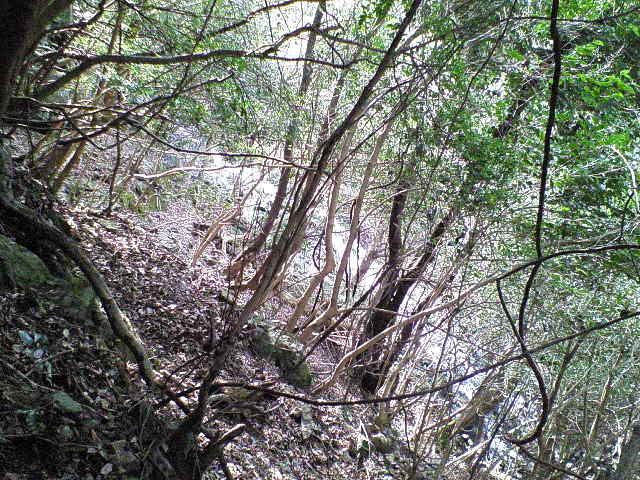 少し下ると左手の雑木越しに滝の最上部が見えてくる。
