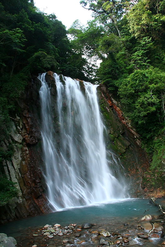 丸尾の滝 2008/07/09 鹿児島県霧島市牧園町高千穂 天降川支流 中津川 落差:20m、幅:25m 「七折の滝」を発ち鹿児島県に山越えし霧島温泉郷に下ってきた。 硫黄の臭いが漂い温泉客で華やいでいる4時半ころR233沿い温泉街のど真ん中に「丸尾の滝」はあった。 流身が独特の斜めの綾模様を出している。 「わ〜凄い!」とギャルの声に「俺のこと?」なんてギャグで大受けしている前期高齢者約一名。 今日のP泊場所はというと訪問歴のある(金さん)が素晴らしく涼しい「道の駅・霧島」選んでくれた。 滝から4Km程下った高台(標高500m)のナイスロケーションだ。 今回の旅で初めての入浴&洗濯&Bunks酒場の宴会とともに快適に熟睡に導かれた。 |