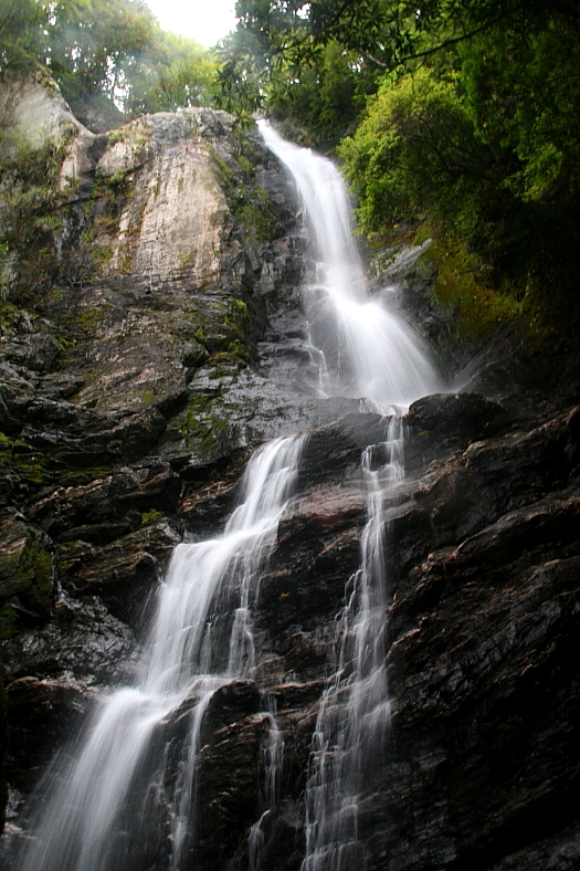 三滝/御滝(みたき) 2010/10/24 高知県吾川郡仁淀川町明戸岩 土居川 葛浦谷(カツロー谷) 落差:20m 滝の向き=南西 やめておけばいいのに鸚鵡返しに「参加」の返事でスカイライン駐車場にやってきたのだが・・。 天候が思わしくなくあっさり「御来光の滝ツアー」は中止。 おいわさん、ひろっさん、yamtoさん、そして我輩の4名の滝バ○が素直に家路につくはずがなく、やってきたのが高知の山奥の”三滝/御滝(みたき)”だった。 見上げて15mと見積もる我輩に、30mはあるとの反論。 おいわさんが20mという。 結局「”おいわさん”が20mと言った」の但し書きで手を打つことになった。 滝の落差の目測なんていい加減なものだ。(~_~) |
