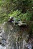 滝下へはその手前40m程の赤テープ急傾斜を、木の幹につかまりながら下る。